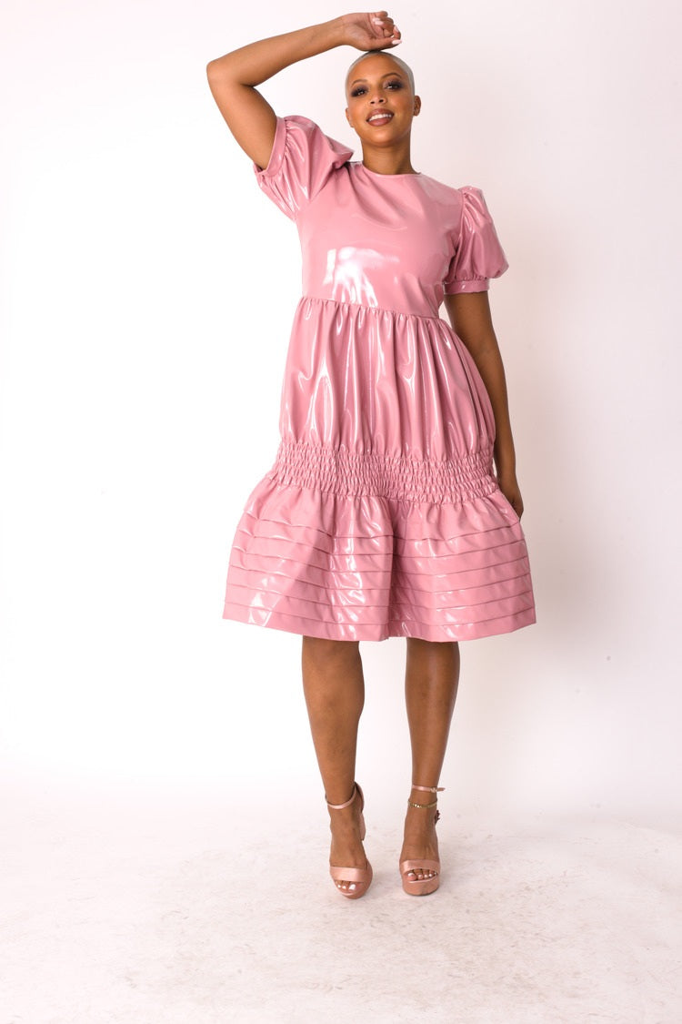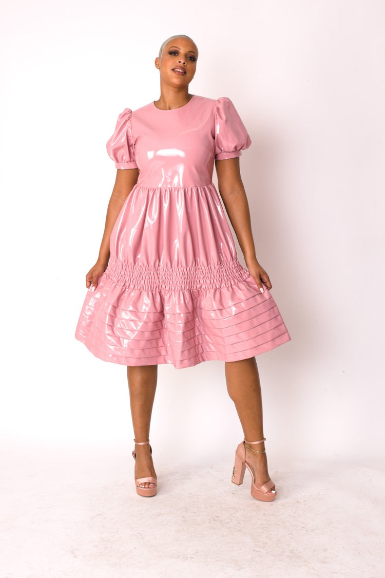 Add glamour to any occasion in this high gloss faux leather dress. Featuring puff sleeves, ruffle hem with rhinestone belt.