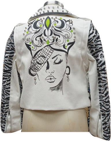 Make a bold statement in this eye catching faux leather jacket featuring detachable sleeves and a bold graphic print. The edgy, on trend design and relaxed fit create a stylish look that can be dressed up or down.
