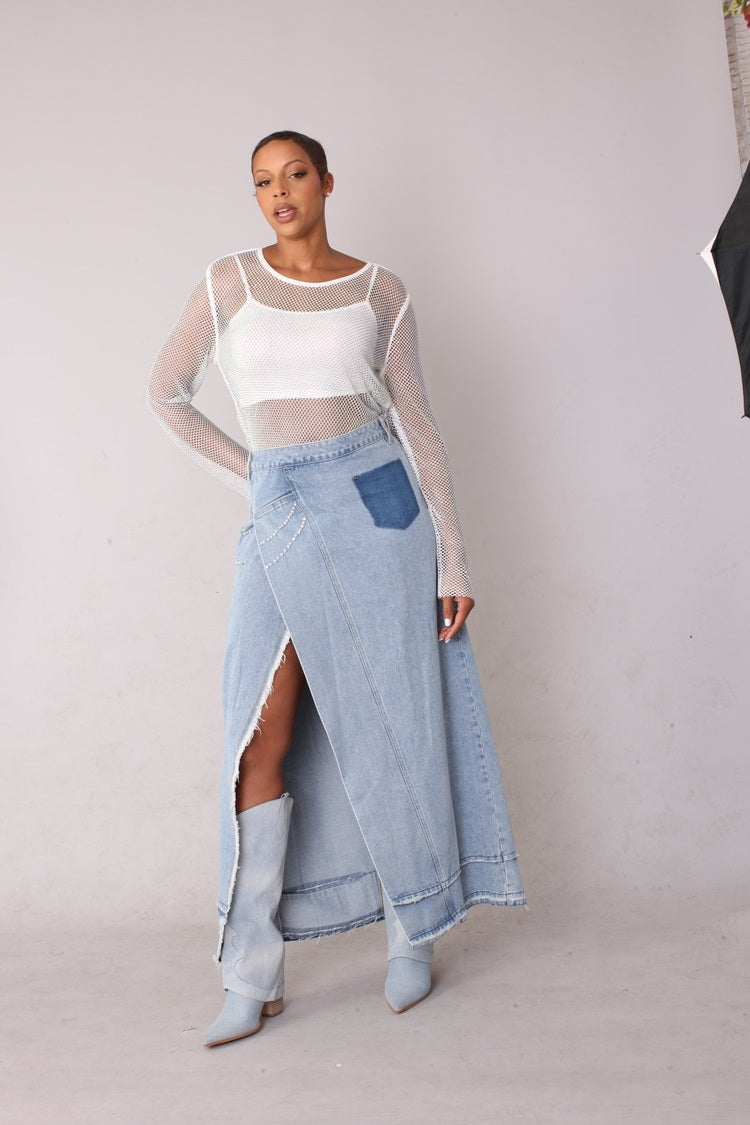 This denim skirt features a dramatic side slit, released hem detail, and sparkling crystal embellishments. The long silhouette is perfect for creating bold, fashion-forward looks that exude effortless style in a light wash.